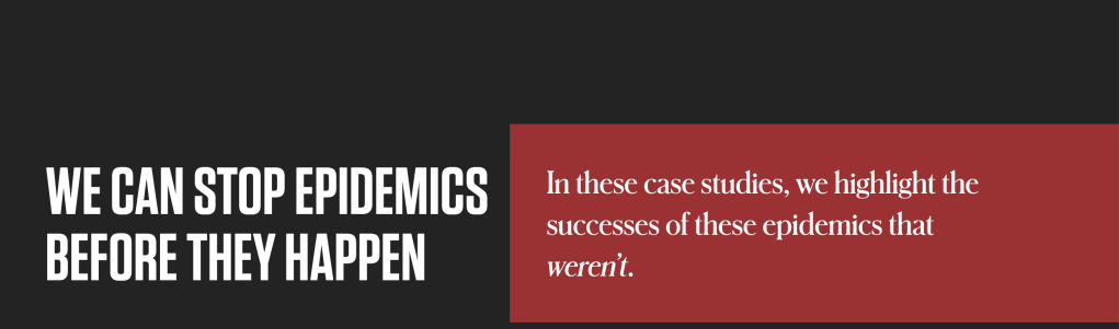 A beautiful visual story on “epidemics that didn’t happen” from Resolve To Lives. This piece also offers key lessons learned and preparedness factors that prevented each epidemic from happening. Must read for any public health afficianodos.