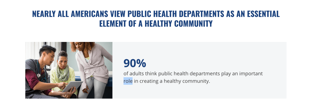 The value of local public health departments– “The de Beaumont Foundation commissioned Morning Consult to survey and track awareness of public health departments, perceptions of their value, and public health priorities. Two surveys were conducted online between May 14-17, 2021 and May 12-15, 2022 among 2,200 adult U.S. citizens.”