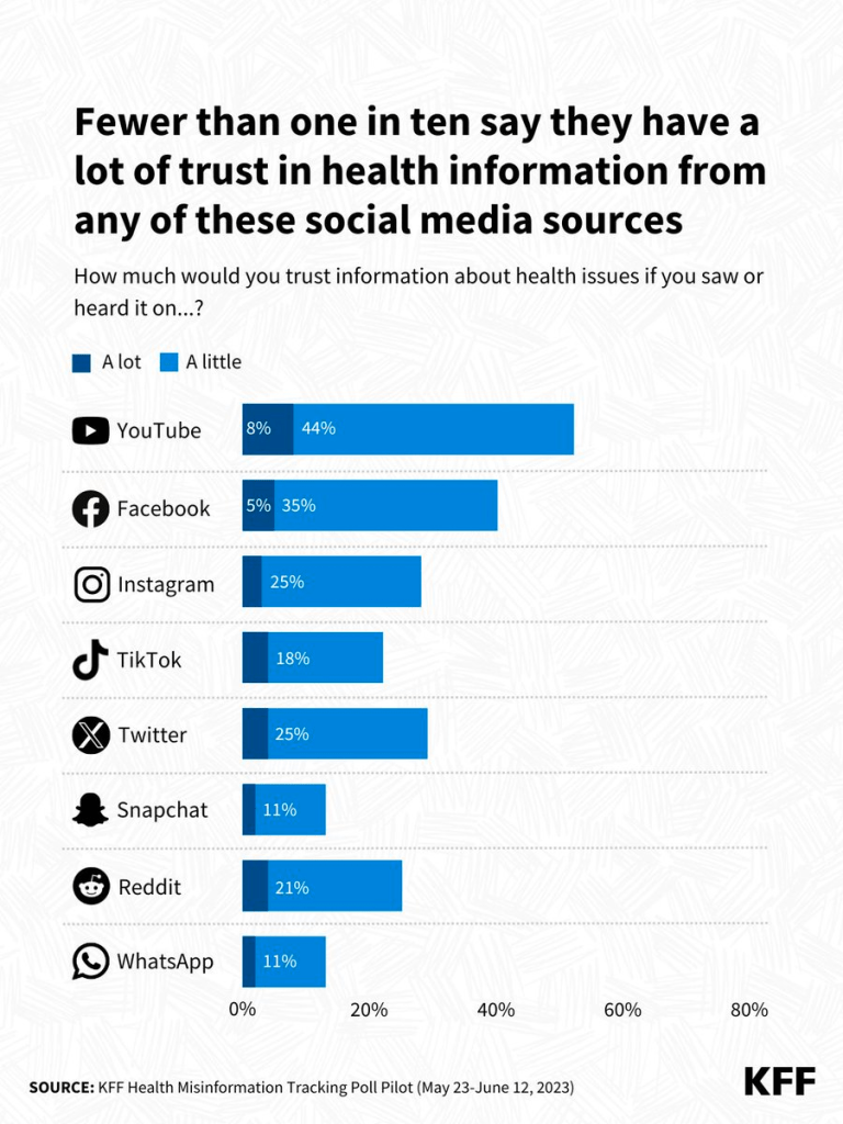 About a quarter (24%) of adults say that they use social media at least weekly to find health information or advice. But fewer than one in ten say they have a lot of trust in health information if they saw it on any of the social media sources listed below.